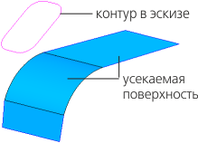 Усечение происходит по линии пересечения усекаемой поверхности с поверхностью, получаемой выдавливанием эскиза перпендикулярно его плоскости.