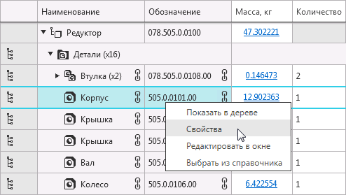 •Показать в дереве — (только для составных частей) позволяет найти составную часть в Дереве модели. Объект, для которого была вызвана команда, выделяется в Дереве. При необходимости раскрывается нужный раздел Дерева, оно автоматически прокручивается так, чтобы выделенная строка была видна.