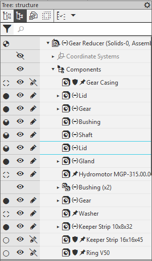 A custom assembly load mode is a combination of load modes for the assembly components composed by the user and stored in this assembly. For example, you can select the loading type Full only for the subassembly with which work is run at the given moment, and Empty for all other components. If you need to see the location of these components in the assembly, you can apply Partial, Simplified or Size load types to them. An example of a custom load mode is shown in Fig. B. Custom load modes are used to load various components in different ways and/or disable editing them.