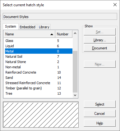 The style selection dialog box will appear on the screen. In the figure below, an example of the hatch style selection dialog is provided. The text style selection dialog is similar to it. By default, the list of styles of the document is displayed in the style selection dialog box (according to the row in the top of the dialog box).