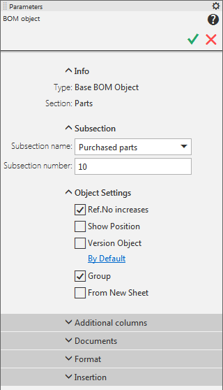 Each parameter corresponds to a field or toggle switch (see section Entering and editing parameters of a BOM item). By changing the state of the toggle switches and the values in the fields, you can edit the parameters of the BOM item.