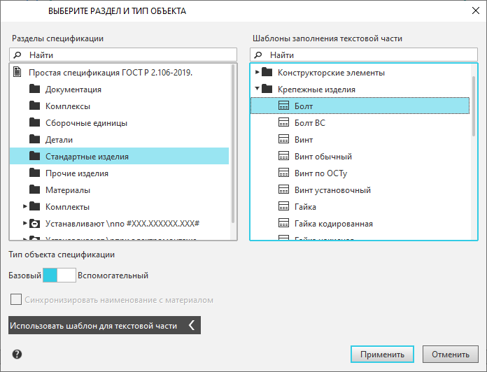 Only templates of the objects that can be created in this section are available for selection. For example, in the Standard items section, you cannot specify a template for any material, but you can select a template for filling in the name of a fastener. |