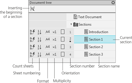 A section is a continuous part of a text document which has certain parameters, such as format, orientation, and detailing of sheets. These settings are configured separately for each section (see section Selection of the detailing and format).