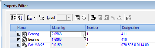 You can edit the values of system properties Material, Density, Mass, and also recalculate the CMP of the model (during recalculation, the mass of the model is determined taking into account the changes in the current density, as well as the mass of the components and solids included in the model).
