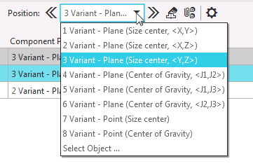 If necessary, you can view all object variants which you can use for a component, and select the appropriate one. To do this, select the desired component and click the field on the toolbar or in the corresponding cell of the column Component Position. A list of object variants used to calculate the position of the component will appear on the screen (see figure).