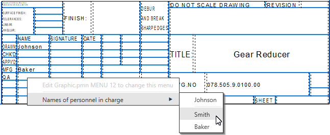 The user menu appears on double-click on any column into which the last name should be entered. It comprises the commands Developers, Process engineers, and Standards check, each containing a submenu – a list of last names (see the Figure). The surname selected in this list is automatically is placed in the column of the title block. If the last name is long, the width of letters will be automatically fitted, and the text will take only the place allocated to it.