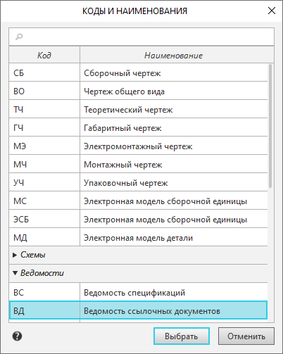 The nomenclature of design documents is established by GOST 2.102-68. According to this standard, a certain code and name corresponds to each document type. While filling in the title blocks of KOMPAS documents, input of these codes and names can be automated.