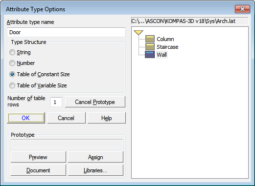 When you enable option Fixed length table or Variable length table in attribute type creation dialog, Assign prototype button appears in the dialog. After pressing it, a group of buttons Prototype appears at the bottom of the dialog, and the prototype selection window appears on the right side — see the figure.