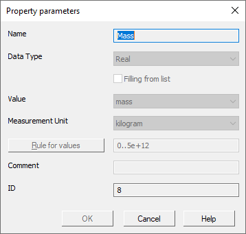 To view parameters of a property selected in the list, click View. A Property parameters dialog will appear on the screen (see the figure below). In the View mode you cannot edit the data contained in this dialog box.