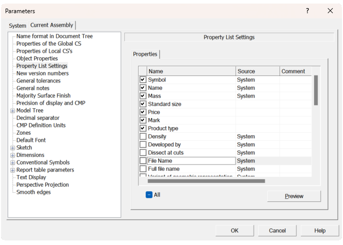 You can set up the properties list for the current document (drawing, fragment, part or assembly) in the Property List Settings dialog box (see figure).