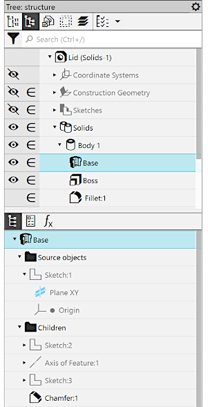 In the Source Objects section a list of the source objects is shown, and in the section Children – of the derived ones. The names of objects in the relations window coincide with their names in the Design Tree (if you entered new names of elements to replace the default names, they will be displayed in the relations window).