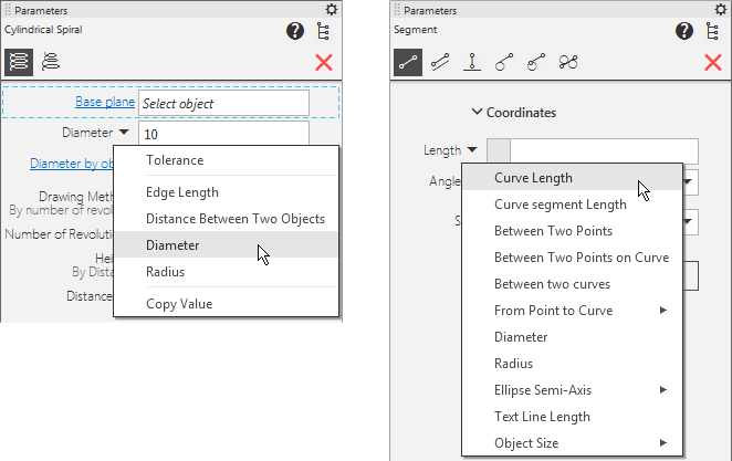 The geometrical calculator commands are contained in the menu of numerical parameter entry fields. This menu is called by clicking the icon