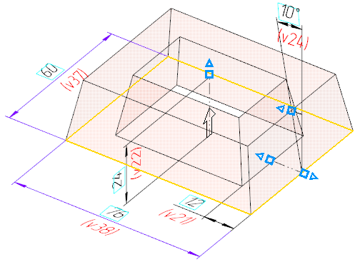 In the above examples, the extrusion distance, slope angle and wall thickness are displayed as the corresponding dimensions and characteristic points; the scaling factor is displayed only as a characteristic point.
