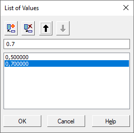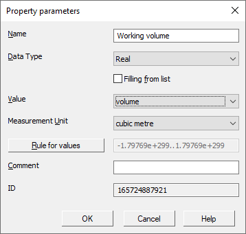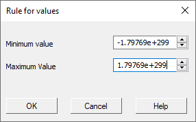 Values of a property can be set within a particular value range or be selected from a predefined list (with the Filling from List option enabled). The first variant is available for Integer or Real value types and the second variant for Integer, Real or String types. When setting a value range, after you click the button, the dialog Rule for values appears (see the figure below). It contains fields for entering minimum and maximum values of a property. When setting a list of values, after you click the button, the List of Values dialog appears (see figure below). For description of controls in this dialog box, see table Dialog for creating a list of property’s values. |