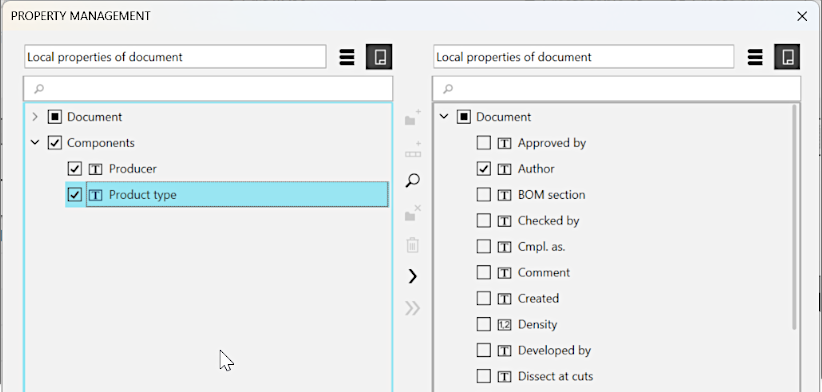 (in the example provided below, copying to the right is performed). The component property will be copied to the list of properties of the current document.