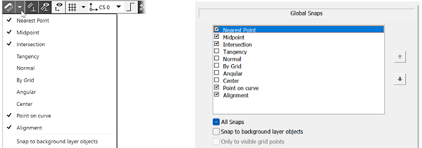 In the parametric mode, constraints arise automatically when triggered. Snaps. If the points to which snapping is possible coincide, then the snap with the higher priority is activated. Priority is determined by the order of snaps in the menu Snaps button and can be changed in the dialog box. Setting global snaps (see Figures).