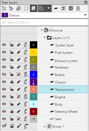 The Layer tree contains rows with the names of the layers and layer groups created in the current model. In the rows, icons display layer state values , as well as fields with numbers and colors of layers. The current layer is additionally marked with a dot in the field with the number of the layer. The name of the current layer is also displayed in the field at the top of the Tree. In the toolbar area of the Tree, there are buttons that allow you to perform various actions with layers. The following operations are available: