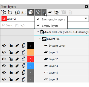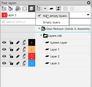 to the right of the button opens a menu with the Non-empty layers and Empty layers commands. You will see a "tick" mark next to the name of each command. To disable the display of layers, call the required command from the list. The "tick" next to the name of the command will disappear (see figure b), and the corresponding layers will no longer be displayed in the Tree. To enable display of layers again, invoke the command once more.