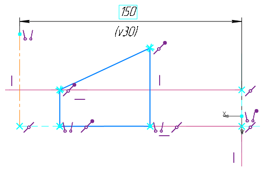 In the constraint display mode the graphic area displays additional icons, representing the presence of constraints, and additional elements (dashed lines, crosses, etc.) for visual representation of those constraints. A rectangular marquee around a dimension value designates a fixed dimension. A variable for a dimension is represented in braces under the dimension value (more details in the Notes on displaying dimensions with variables). The figure shows an example of a sketch in the constraint display mode.