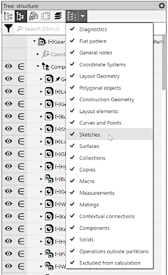 . Clicking the arrow opens a menu with commands named in the same way as the sections (see figure). The Operations outside sections command is an exception — it does not correspond to any section but allows to enable or disable display of operations that are not part of any section in the Tree. Such operations can be arrays in the assembly, editing operations applied simultaneously to several solids, surfaces, or components (for example, "Hole" applied to the solid and component), and others.