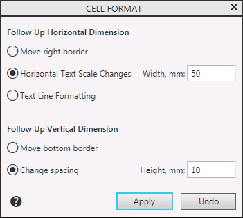 Allows you to specify the height of the row and the width of the column that contain the selected cell, as well as the "behavior" of the table when entering text into this cell. If a range of cells is selected, you cannot enter the row height and the column width.