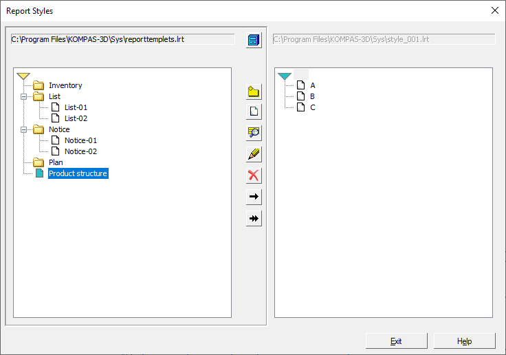 Displays a list of library styles. The dialog has two preview windows, in which they can simultaneously display lists of styles of two different libraries. Only one window can be active — it is selected with a frame. To activate a window, click it. Style lists have a treelike structure, with sections, subsections etc. containing styles. The nesting level of sections is unlimited. All objects of the tree are automatically sorted by names inside each section. |