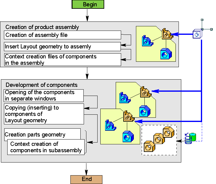 This method suggests step-by-step creation of components, from the top to the lower levels, in the context of the models to which these components belong. After creation, components are developed in separate windows. Parts building is based on copies of the detailing geometry objects, while subassemblies building is based on the detailing geometry inserts.
