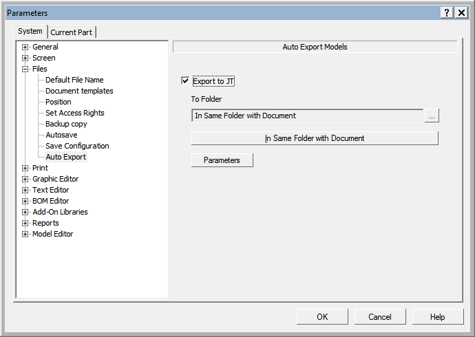 Automatic export is mainly used to integrate KOMPAS-3D into a PLM system environment using the JT format. The export parameters and the location of the resulting files in this case depend on the PLM system requirements to such files.