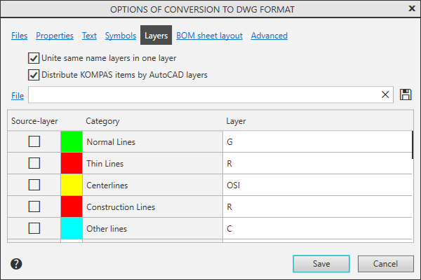 To save the settings made in the file, click this button. In the dialog that appears, specify the name of the file to be written. The software will generate a binary file with information about AutoCAD layer names and colors for KOMPAS-3D objects (*.LAC). |