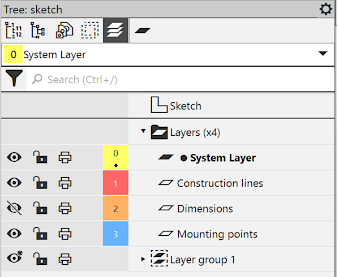 Drawing Layer tree is similar to Fragment tree (they have different toolbars) and contains rows with names of layers and groups of sketch layers. Actions with layers in the Sketch layer tree are similar to actions when working with layers in a graphic document and are described in detail in section Layers. In the Sketch layers tree, the following actions are available:
