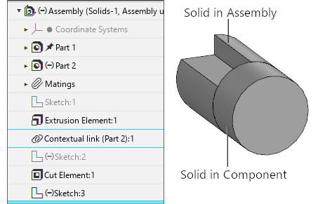Contextual Link (Part 2):1 (Figure 2) appeared. When further working with the assembly, the solid built in it has changed — a cut was made in it. Cut operation