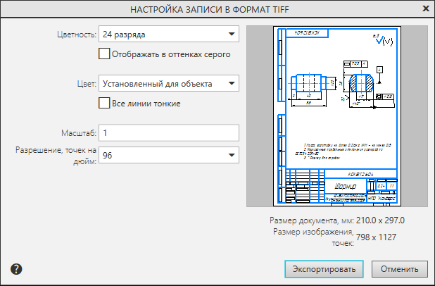 Настройка параметров экспорта в растровый, EMF и PDF форматы выполняется в соответствующих диалогах. Краткое описание диалогов для различных типов документов приведено в следующих разделах.