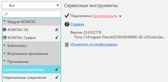 •Модуль КОМПАС-3D может быть в состоянии Подключено или Отключено. В первом случае в Конфигураторе в строке модуля отображается значок