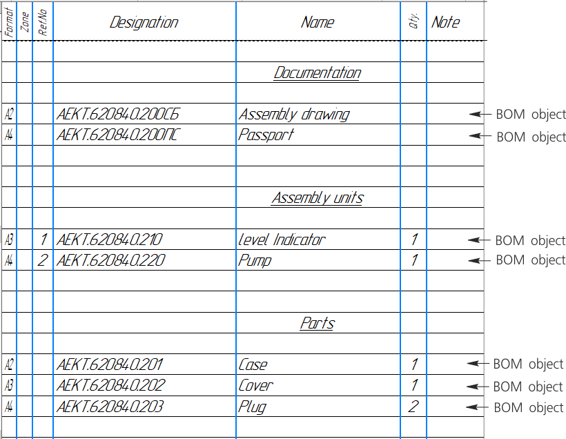 If we apply this terminology to the "paper" BOM, we can say that a BOM item is a line (or several lines) with data on one subject, see figure.