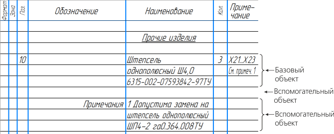You can only create auxiliary objects manually. We recommend using them to perform the BOM detailing operations that can not be performed using base items only (see figure). For example, using an auxiliary BOM item, you can enter arbitrary text (comment) in the BOM table or create an empty row in the midpoint of the section. Since the section item sorting rules do not apply to auxiliary objects, the position of the auxiliary item string does not depend on the texts inside this string.