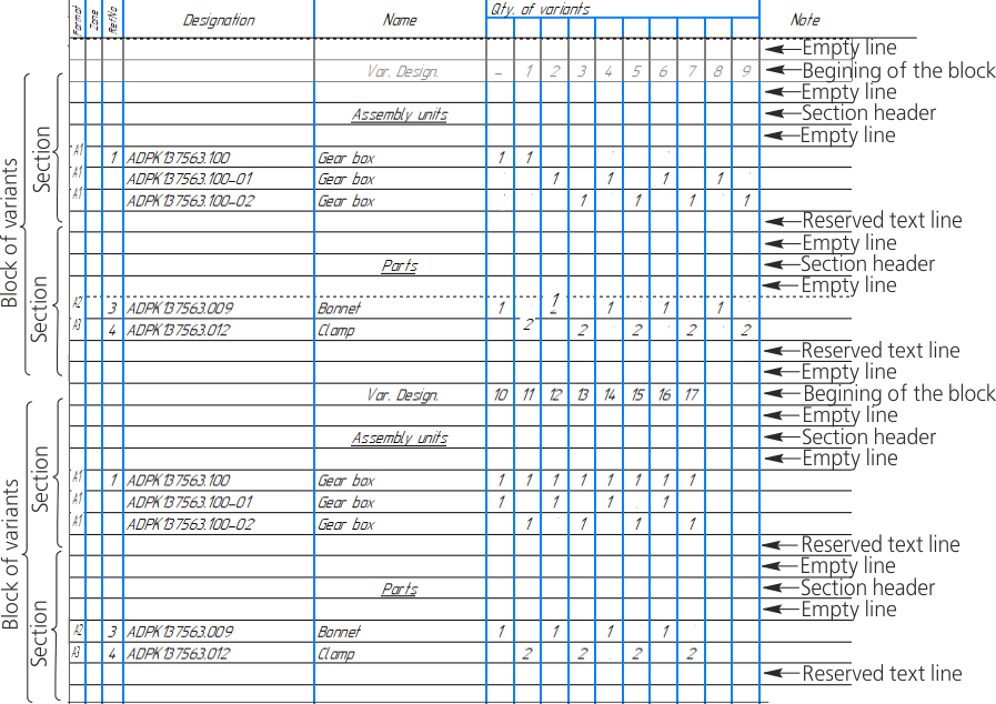 If the beginning of the version block is in the beginning of the BOM sheet, the numbers of the versions are placed in the "header" of the BOM. If the beginning of the version block is in the midpoint of the sheet, then the blocks are separated from each other by the row "Indic.of Exec." designations of executions), containing in columns Quantity per execution indications of designations of the subsequent block. This line is called the beginning of the block, see figure. Like the section header, it is framed with empty rows at the top and bottom.