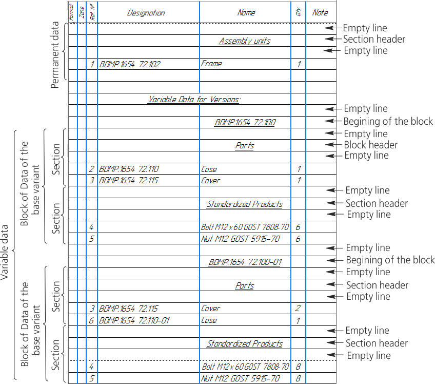 1.In the BOM, the Variable data for versions header is created. According to the standard, it is located after the fixed data. Below this header, blocks are formed, i.e. groups of variable data related to the same product version. The beginning of the block is a string containing the designation of version. The beginning of the blocks are formed automatically using the designation specified in the title block of the BOM.