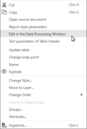 The context menu of an associative report contains standard commands for managing an object, such as cutting, copying, creating hyperlinks etc., as well as commands for editing the report in the Data Processing Window, opening the source document, inputting names and updating (see the Figure).