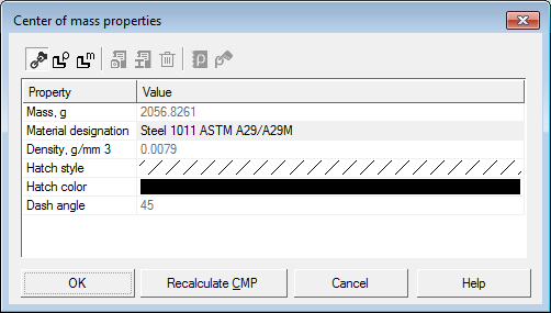 After you click the button, mass properties of an object (part, component or solid) are calculated with account of CMP changes previously made for the solids and components contained within the object. The mass recalculation result is displayed in the Mass row of the dialog box.