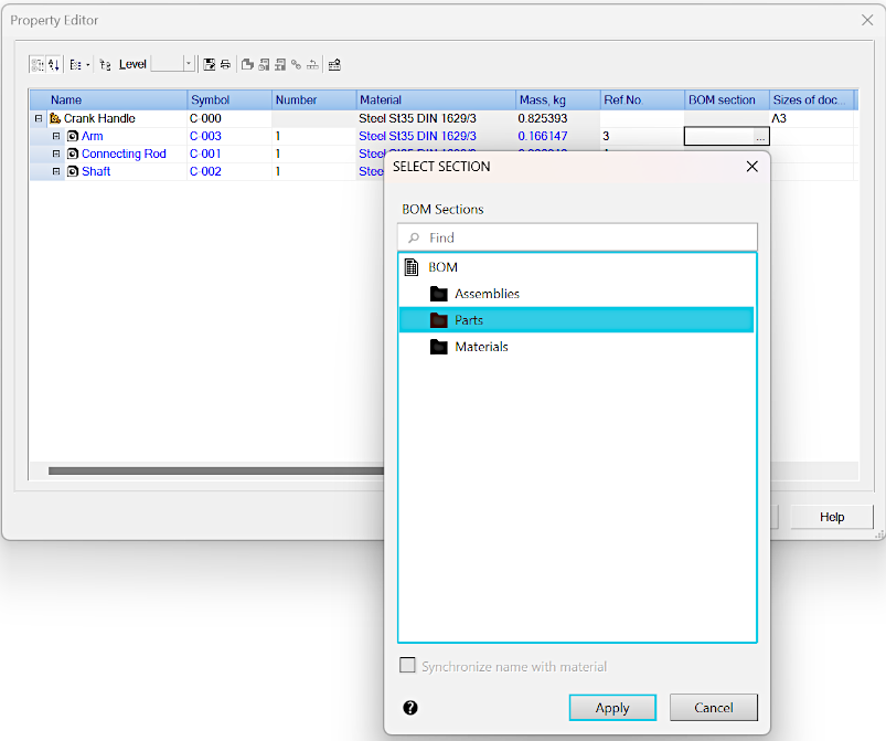 The BOM Section property determines in which BOM section the BOM object, generated based on properties of the document object, will be located (in the assembly – component or solid, in the drawing – a macro-element, view or fragment insertion).