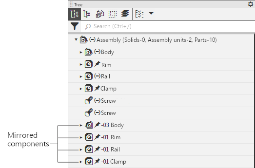 They have icons similar to icons of components of the same type (part, assembly, etc.). If a component is a mirrored version of the original one, then its icon is displayed in a mirrored view (see figure).
