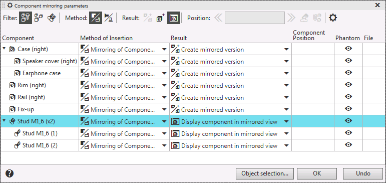 To change most of the mirroring parameters, you can use both the toolbar items and the table cells. Some parameters can only be changed using the table. For example, you can only manage display of component phantoms using the cells of the column Phantom
