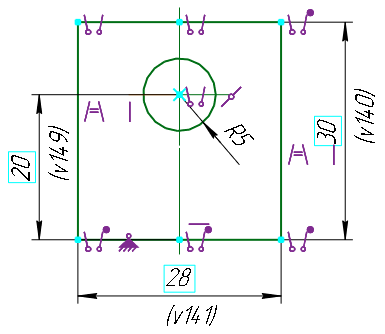 The figure shows an example of a predefined sketch with default object indication settings (in KOMPAS-3D, the Light theme is selected and the workspace background is set to white).