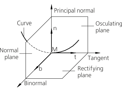 Three mutually perpendicular planes are connected with each point of the curve: normal, osculating and rectifying planes, as well as three mutually perpendicular basis vectors: tangent t, principal normal n and binormal b.