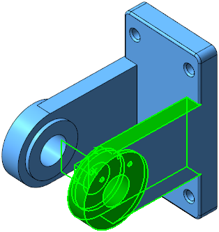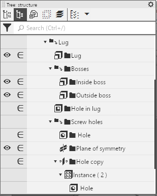The figure shows the Eye lug macro-element as an example. It contains the following objects: an eye lug with external and internal bosses and a hole, as well as holes for screws. Bosses and screw holes, in their turn, are combined into the macro-elements subordinate to the Eye lug macro-element.