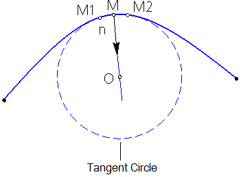 A tangent circle is defined as the limiting position of a circle when it passes through point M and two other points M1 and M2 that are infinitesimally close to it (see figure). The osculating circle lies in the osculating plane of the curve at point M (for osculating plane see section). Basis vectors at a curve point Add-Ons Curves and Surfaces).