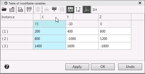 For arrays By grid, By Circular Pattern and along a curve The number of instances is determined when specifying array parameters, and for array by points — is determined by the specified points. Thus when working with these arrays you cannot control number of table rows using buttons of Table of modifiable variables dialog.