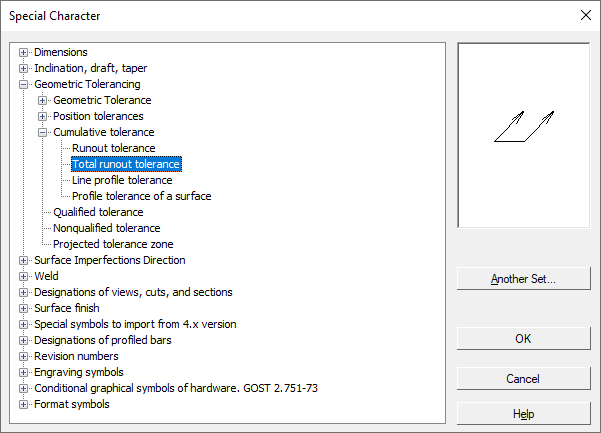 By default, the characters and designations stored in the graphic.sss file (a text file containing descriptions of special characters) are used. It is shipped together with the system and is stored in the subfolder \Sys of the main folder KOMPAS-3D.