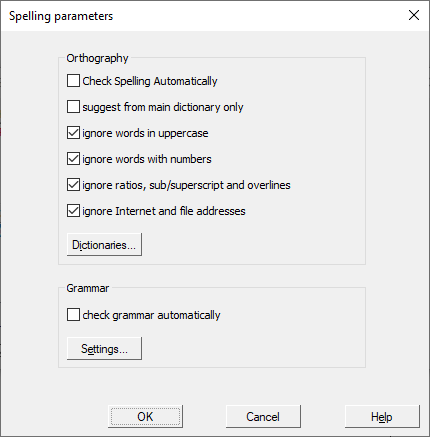 Setting up spellcheck parameters is performed in the Spelling parameters dialog.