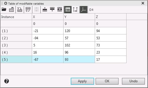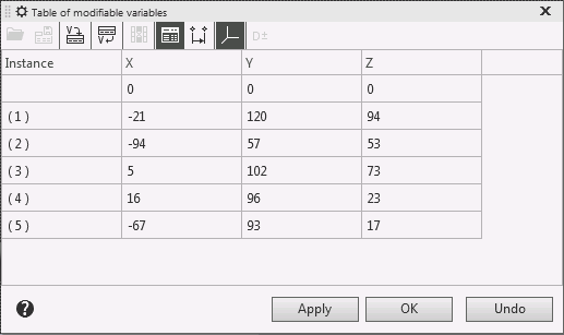 A table of modifiable variables is created in the model, containing data from the file. Dialog window with this table appears on the screen. Cells with coordinates (except coordinates of the base point of the object being copied) are marked white. This means that these cell values can be edited.